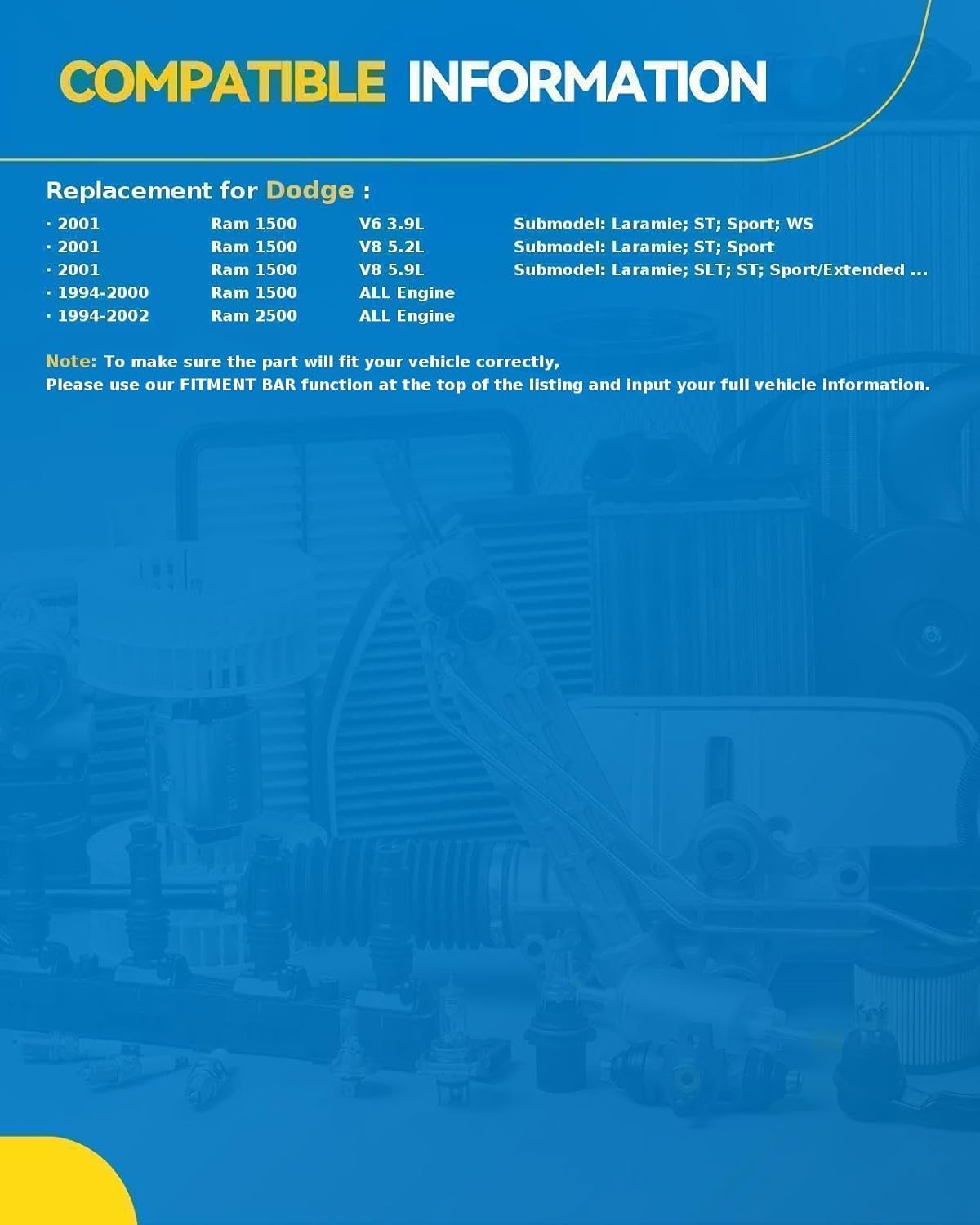 - ✅【】 Cold Air Intake System Kit Replacement for Dodge 1994-2001 Ram 1500, 1994-2002 Ram 2500 V8 5.2L 5.9L (Please MATCH your vehicle on the left top before purchasing). [Package included]: 1 x Air Filter, 1 x Air Intake Tube, 1 x Silicon Hose, 1 x Silicon Connecter, 1 x Filter Heat Shield, All accessories on the picture are included